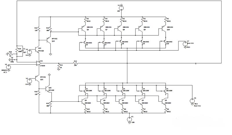 The output is the big "+" at the middle the op-amp is the LT1818 and the trannies are non standard LTspice models,otherwise I would have provided the sim.(It is slow as hell anyway)