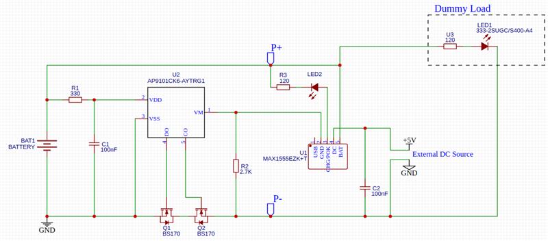 I have a single 18650 Li-Ion cell that I'm trying to protect with the AP9101 chip and also charge with the MAX1555 chip. Here's my schematic, I checked and rechecked everything and I can't seem to make it work. Right now I'm unsure about how I interconnected the two ICs, maybe it's all wrong from the start...
